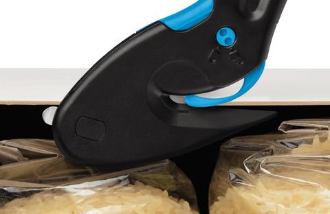 SECUMAX EASYSAFE övertygar med sina speciella egenskaper. Den framträdande och spetsiga nosen på skärverktyget sticker lätt igenom plastsäckar och filmlindade pallar. Det dolda bladet skär lätt av säckar och film. En integrerad materialguide gör det lättare att skära tunna film- och pappersark; inte ens enstaka lager fastnar. Vad sägs om tunna textilier eller plastband? Inget problem för det dolda bladet.
